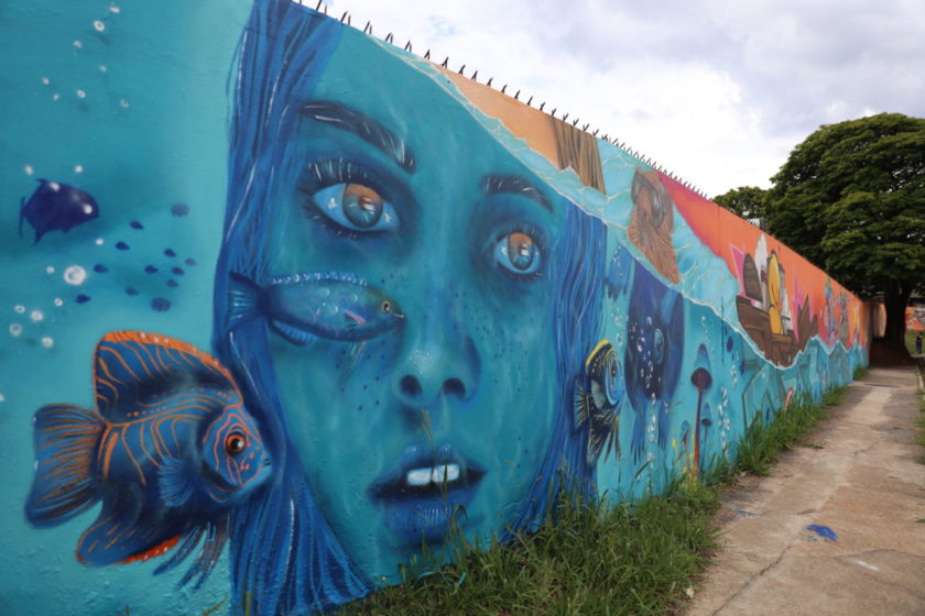 Cada artista imprimiu seu estilo e identidade visual, resultando em um conjunto harmônico que integra todas as obras. O grafite apresenta duas temáticas principais: uma parte do muro retrata o fundo do mar, com cores e elementos aquáticos, a outra, a Mata Atlântica, em uma representação vibrante da natureza.